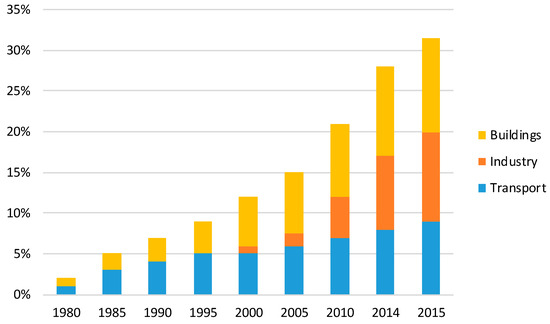 The fuel and technology switch, and moving towards a service-oriented economy, permit obtaining the difference in the energy consumptions with respect to the past decades. Energy gains are favored by mandatory energy efficiency regulations, which have been put in place in OECD and non-OECD countries. In 2015, global final energy consumption has been covered for 30% by efficiency-regulated energy use, and the average stringency of regulation has increased by 23% since 2005 [3]. As seen in Figure 9, efficiency-regulated energy uses in 2015 covered around 30% of global final energy consumption and it has an increasing trend. The major efforts were addressed towards the industry sector in China, while United States and Japan were more interested in building sector.