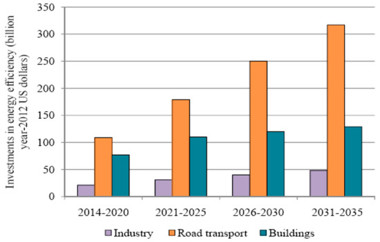 By 2035, investments will grow in the transport sectors, as shown in Figure 10, thanks to a more efficient vehicle fleet. Meanwhile, investments in building sector will rise, for both residential and services sectors, reaching 2334 billion dollars by 2035 [30]. The investments in building include the use of less-consuming devices and appliances, as well as interventions of insulation or retrofits.