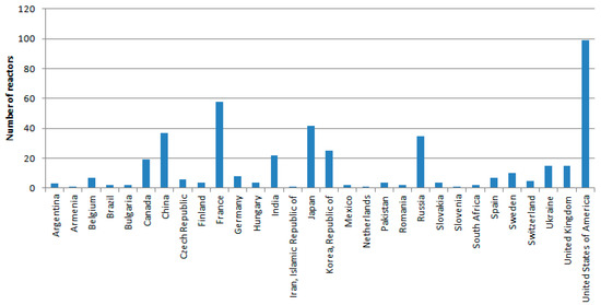 In 2016, the International Atomic Energy Agency (IAEA) counted 449 operational reactors corresponding to about 391 GW of net installed capacity, and 60 reactors under construction, 24 of which are in China [33]. Meanwhile, 157 reactors are in permanent shutdown. Figure 12 shows the current status of the nuclear reactors, including reactors in operation and in long-term shutdown.