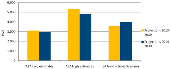 Figure 14 shows the prospects for nuclear in the IEA New Policies scenario and IAEA scenarios: the IAEA “Low” scenario is based on the current market conditions, on the contrary “High” scenario is more positive: it expects a continuous growth of economic and nuclear demand. Figure 15 compares the contribution of nuclear power in the electricity generation between WEO’s central scenario and the IAEA’s prospects: in the latest outlook editions, the nuclear share has been revised downward in the IAEA estimates [1,32]. The policies adopted after the Fukushima accident are included in the assumptions. In addition, IAEA assumes that the low prices of natural gas and the subsidies to RES affected the growth rate of nuclear power. Growth in nuclear power for electricity generation is confirmed by the World Energy Outlook 2016 [3]. Indeed, between 2015 and late 2016, 19, new nuclear reactors are in operation, most of them in China. Currently, around 64 GW of nuclear power capacity are under construction, mainly in China, Russia, United States, the European Union and India.