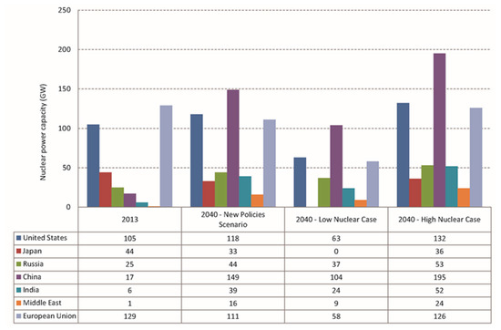 The evolution of installed nuclear capacity by regions during 2013–2040: comparison between IEA’s scenarios. Source: IEA, 2014a [1].