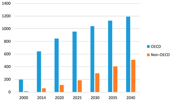 The non-OECD countries will remain dominant forces in the future energy scenarios. China and India are expected to be among the largest economies in the world in 2035 [30]. In the same period, Russia will become the major exporter in the energy market. The fast increase of the GDP and the population growth will be the drivers of the non-OECD demand.