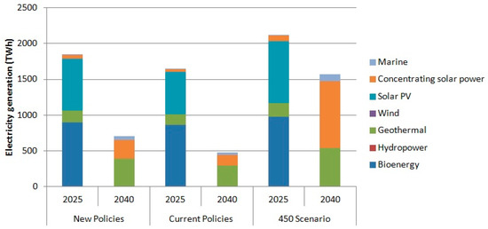 In each of the scenarios outlined by the WEO-2016 [3], it is expected that electricity will be the sector that will increase at higher rates with respect to the other sectors, i.e., road transport and heat consumption. Electricity generation from RES is projected to increase by 125–250% from 2013 to 2040. By taking into account the New Policies Scenario, which is the central scenario of the WEO-2016, 37% of world electricity generation by 2040 will come from RES. In the Current Policies scenario, the share of RES in electricity generations will amount to 29% by 2040, while in the 450 scenario it would reach 58% (Table 8).
