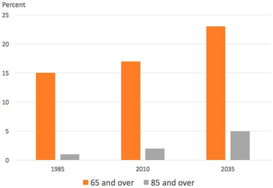 Percentage of older people in the UK according to the Office for National Statistics, National Records of Scotland, Northern Ireland Statistics and Research Agency 1985 to 2010 estimates.