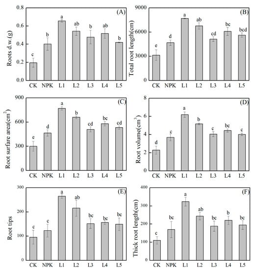 Effects of CK, NPK, and organic liquid fertilizers (L1: shrimp extracts; L2: plant decomposition; L3: vermicompost; L4: seaweed extracts; L5: fish extracts) treatments on the root architecture of chrysanthemum at 60 days after transplanting. (A) Root dry weight; (B) total root length; (C) root surface area; (D) root volume; (E) root tips; and (F) thick root length. Every value is expressed as the mean ± standard deviation. Different letters indicate significantly statistical differences at the p < 0.05 level as determined by Duncan’s multiple range test.