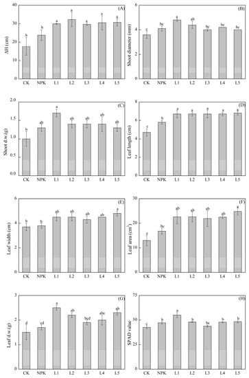Effects of CK, NPK, and organic liquid fertilizers (L1: shrimp extracts; L2: plant decomposition; L3: vermicompost; L4: seaweed extracts; L5: fish extracts) treatments on the aboveground growth of chrysanthemum at 60 days after transplanting. (A) ΔH; (B) shoot diameter; (C) shoot dry weight; (D) leaf length; (E) leaf width; (F) leaf area; (G) leaf dry weight; and (H) SPAD value. ΔH indicates the shoot height change during the growth stage; leaf length and width were measured using the largest leaf of the plant. Leaf area was estimated as follows: leaf length × width × 0.75. Different letters indicate significant differences among treatments as determined by Duncan’s multiple range test at the p < 0.05 level.