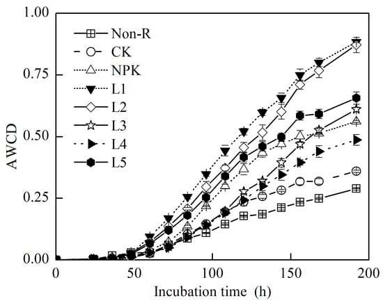 The AWCD was used as an indicator of the microbial activity in the soil. As presented in Figure 3, the AWCD of the rhizospheric soil was almost zero over the first 50 h of incubation, and it experienced a rapidly increasing stage, subsequently. The highest AWCD values were achieved under L1 and L2 treatments, while the lowest AWCD values were exhibited under the Non-R and CK treatments. The addition of liquid organic fertilizers significantly increased the AWCD values after incubation, and the AWCD values of rhizospheric soil treated with L1–L5 were 2.46, 2.43, 1.70, 1.35, and 1.83 times greater, respectively, than those of the CK soil. Thus, the addition of liquid organic fertilizers generally improved the functions of chrysanthemum rhizospheric soil’s microbial community. Additionally, treatments with L1 and L2 affected the increase in the AWCD. The AWCD under treatment L5 showed no significant variation compared with the NPK treatment, whereas the AWCD values of the L3 and L4 treatments at the preliminary stage of incubation were lower than the NPK treatment, but the AWCD of the L3 treatment exceeded that of the NPK treatment at the end of the incubation.