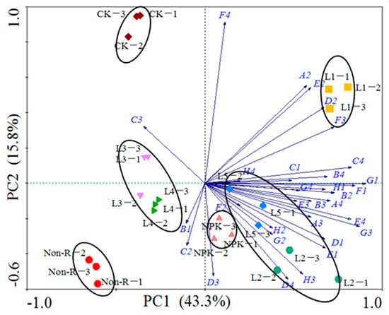 PCA of diverse uses of carbon sources after the 96-h incubation of the chrysanthemum non-rhizospheric (Non-R) soil and rhizospheric soil treated with CK: control; NPK: chemical fertilizer treatment; L1: shrimp extracts; L2: plant decomposition; L3: vermicompost; L4: seaweed extracts; and L5: fish extracts. Carbon substrates of the BiologTM Plate include: A2: β-methyl-d-glucoside; A3: d-galactonic acid g-lactone; A4: l-arginine; B1: pyruvic acid methylester; B2: d-xylose; B3: galacturonic acid; B4: l-asparagine; C1: Tween 40; C2: i-erytritol; C3: 2-hydroxybenzoic acid; C4: l-serine; D1: Tween 80; D2: d-mannitol; D3: 4-hydroxybenzoic acid; D4: l-phenylalanine; E1: α-cyclodextrine; E2: N-acetyl-d-glucosamine; E3: γ-hydroxybutiric acid; E4: l-threonine; F1: glycogen; F2: d-glucosaminic acid; F3: itaconic acid; F4: glycyl-l-glutamic acid; G1: d-cellobiose; G2: glucose-1-phosphate; G3: α-ketobutiric acid; G4: phenylethylamine;H1: α-lactose; H2: d,l-α-glycerol phosphate; H3: d-malic acid; and H4: putrescine.