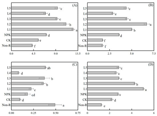 As demonstrated by the PCA (Figure 4), 59.1% of the total variance was explained, with the first principal component explaining 43.3% of the variance. The microbial community primarily clustered into six distinct groups: the CK, L1, L3/L4, L2/L5, NPK, and Non-R, and, as revealed by the PCA analysis, the liquid organic fertilizer treatments, could significantly influence the bacteria’s carbon source utilization in the rhizospheric soil. The NPK treatment was separated from the liquid organic fertilizer treatments on the PC1 axis, and the CK treatment could be separated from the liquid organic fertilizer treatments on the PC2 axis. The metabolic activities in the rhizospheric soil under different fertilizers indicated that the microbial community was capable of growing by ingesting diverse types of carbon sources under different conditions. For example, the main carbon substrates utilized under the CK treatment was 2-hydroxybenzoic acid, whereas under the NPK treatment it was 4-hydroxybenzoic acid. Under the L5 treatment d-mannitol and N-acetyl-d-glucosamine were the main carbon sources. Moreover, significant differences were detected in the utilization of the six main carbon sources (carbohydrates, carboxylic acid, phenolic compounds, amino acid, polymer, and amines) (Figure 5). Carbohydrates and carboxylic acid were the major carbon sources for different treatments. The highest utilization of carbohydrates was achieved under the L1 treatment, and the optical density (OD) value was 2.29 times that of the CK treatment. This was followed by L2, and the lowest utilization values occurred under the CK and Non-R treatments. The highest utilization of carboxylic acid was achieved under the L2 treatment, and the OD value was 3.89 times that of the CK treatment. There were no significant differences in the utilization of the other fertilizer treatments. The utilization of phenolic compounds was highest under the Non-R treatment and lowest under the CK treatment, while the utilization of amines from the rhizospheric soil under fertilizer treatments (except L3 and L4) was higher than that observed in other unfertilized treatments. There was a similar pattern for the utilization of amino acids and polymers, where the highest utilization occurred under the L1 and L2 treatments and there were no significant differences among the other fertilizer treatments.