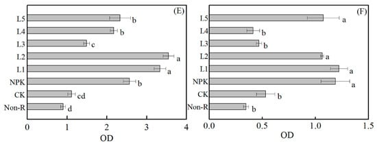 The OD values of diverse carbon substrates after the incubation of chrysanthemum rhizospheric soil treated with CK: control; NPK: chemical fertilizer treatment; L1: shrimp extracts; L2: plant decomposition; L3: vermicompost; L4: seaweed extracts; and L5: fish extracts. Non-R: non-rhizosphere soil. The main carbon sources were as follows: (A) carbohydrate; (B) carboxylic acid; (C) phenolic compounds; (D) amino acid; (E) polymer; and (F) amine. Different letters indicate significant differences among treatments as determined by Duncan’s multiple range test at the p < 0.05 level.