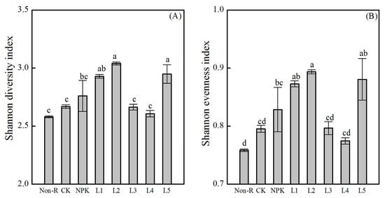 Effects of the various fertilization treatments on the Shannon diversity index (A); and Shannon evenness index (B) of the rhizospheric soil of chrysanthemum. Treatments were as follows: CK: control; NPK: chemical fertilizer treatment; L1: shrimp extracts; L2: plant decomposition; L3: vermicompost; L4: seaweed extracts; and L5: fish extracts. Non-R: non-rhizospheric soil. Every value shown in the bar is expressed as the mean ± standard deviation. Different letters indicate significantly statistical differences at the p < 0.05 level as determined by Duncan’s multiple range test.