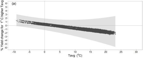 Our results demonstrate a significant effect of climate variables on crop yields. Increases in Tavg are harmful to yields, with a 0–2% yield reduction per additional 1 °C Tavg, because of the associated shorter growing season [14]. Lower yields will be caused by drought in most counties except under very moist climate conditions (i.e., SPEI is approximately 0.5), where yields will be increased. The inverse yield responses to SPEI are associated with less severe water logging and disease under a very wet climate, and hence higher yields, when SPEI is reduced [22,23].