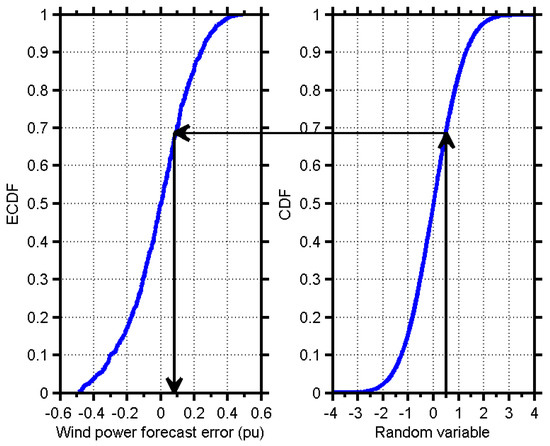If the covariance matrix is obtained as explained above, one can generate the random variable set via a multivariate random number generator. Distribution transformation is a useful method to convert these jointly-distributed variables () to forecast error scenarios (). A detailed explanation of this process and overall algorithms are given in the next section.