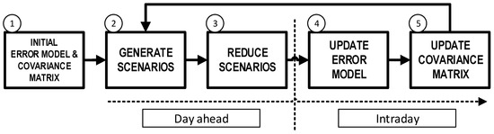 - Step (1): If historical forecast data and actual error data are available, use them to obtain the initial error model and covariance matrix. The error model consists of 20 ECDFs obtained from historical errors occurring within 20 power levels (power bins). The error modelling procedure is given in Section 2.2. The MATLAB function ecdf is used in this procedure. Use Equation (7) to update Σ. If historical data is not available, one can set to be equal to a unit matrix.