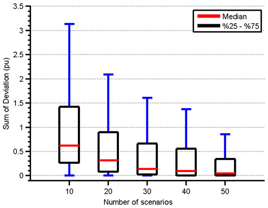 Some actual measurements can be out of the scenario set region, which is an unwanted situation. The sum of the deviation metrics is equal to the sum of the distances between the scenario set and the actual measurements which are out of the scenario set. Thus, the smallest value in Figure 5 is the best result. Formulas for this metric are given in Section 2.5. As we expected, the test results showed that if the number of the reduced scenarios in the reduced scenario set increases, the value of this metric decreases. When the number of scenarios reached 50, the obtained metric values are very close to zero. Thus, we concluded that 50 scenarios are enough to represent the stochastic wind power generation. The second test evaluates the of the scenario set. The results of this test are given in Figure 6.