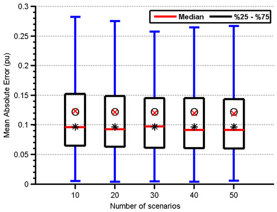 The mean absolute error () of a reliable scenario set must be less than, or close to, the actual mean absolute forecast error. The formula of the metric is given in Section 2.5. Our test results showed that the of all reduced scenario sets is close to the actual mean absolute forecast error. Being in accordance with the previous test results, the number of scenarios is set to 50.