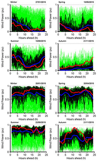 Green lines are the 400 initial scenarios, black lines are the 50 reduced scenarios, the red line is the actual power, and the blue line is the day-ahead forecast power. Scenarios are for high and low wind-occurring days of four seasons.