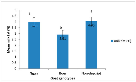 The effect of genotypes on milk fat percentage of Nguni, Boer, and non-descript goats, a,b means of milk fat percentage with different superscripts differ significantly (p < 0.05).