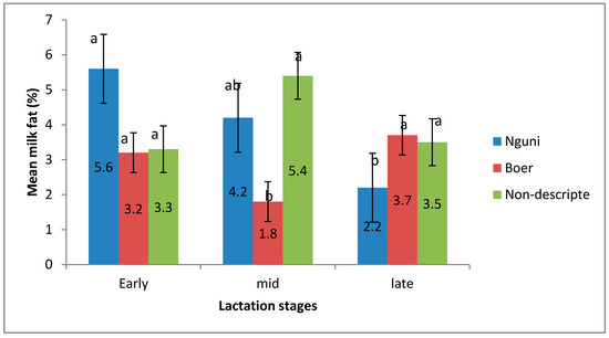 The effect of lactation stages on milk fat percentage of Nguni, Boer, and non-descript goats. a,b within each stage of lactation, means of milk fat percentage with different superscripts differ significantly (p ˂ 0.05).