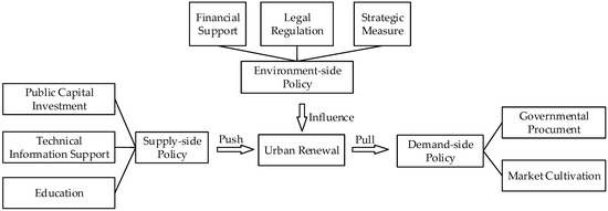 These policies aim at removing barriers during the entrance of market forces and reducing potential risks in the market via government procurement, trade control and other actions. They provide some necessary measures to reduce market uncertainty through the implementation of several instruments, such as government procurement, and market cultivation. Generally, the interaction of the classifications of urban renewal policies is presented in Figure 1, which illustrates graphically how the three sides of policy influence the promotion of urban renewal.