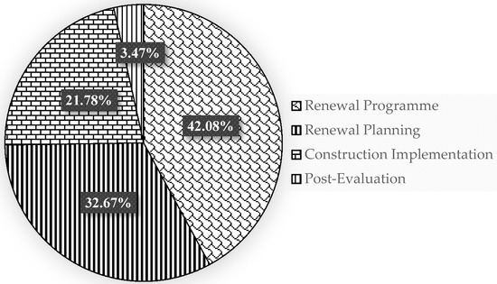As Figure 3 shows, Renewal Program has the highest percentage of the total policy counts, with 42.08%. This is much higher than the other three stages including Renewal Planning (32.67%), Implementation Construction (21.78%), and Post-Evaluation (3.47%). The findings indicate that the policy focuses mainly on renewal programs and some focus is placed on the earlier stages of the project lifecycle. However, the post-evaluation phase is rather neglected.