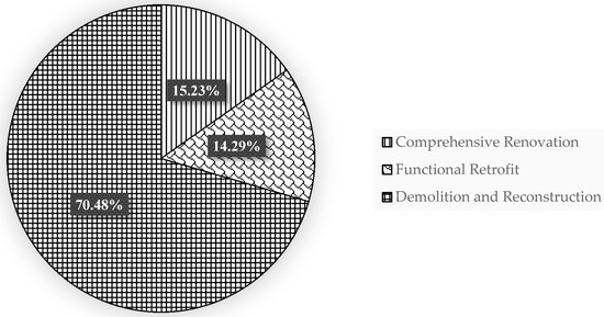 - Comprehensive Renovation of urban renewal projects improves fire-fighting devices, public facilities and infrastructure, as well as renovating the facade or upgrading the utilities and services of existing buildings. The core structure and function of the buildings remain intact. Therefore, by examining these variables, it can be illustrated that the main focus of policies occurs in regards to the nature of the urban renewal activity, and the activity’s dimensions can be explored to determine the implementation mechanism of urban renewal policy instruments, along with the strength of their impact.