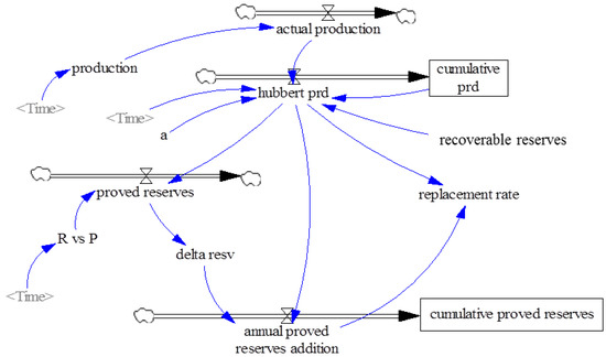 In the rest of the paper, we construct a system dynamics model to simulate the Hubbert peak using the Vensim software. Using the system dynamics model implemented in Vensim for the complex calculations has several advantages. First, the parameters can be calculated with more suitable values automatically. Second, a number of other relevant parameters (variables of production, actual production, cumulative production, reserves (R) vs. production (P), and annual proved reserves addition) can be calculated simultaneously if needed. Third, system dynamics modeling allows us to simulate different policy strategies in order to understand system feedback effects [54].