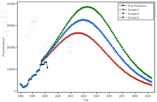 - Scenario 1: NR = 18,590,000 tons. This recoverable reserve value is estimated by Su Bo, the Vice Minister of China’s Ministry of Industry, who announced that the NR of China’s REEs was 18,590,000 tons on 20 June 2012. In this scenario, the peak for China’s REEs production appears in 2038, with a value of 264,900 tons. To facilitate the later comparison of the simulation scenarios, the results of Scenario 1 will be considered as the main results, and the equations are presented in the Appendix.