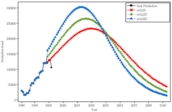 It is undeniable that technological advances, the development of REEs end-use industries, policy interventions, politics, and other factors will affect China’s REEs production and peak time trends. Moreover, the intrinsic growth rate will be changed as all of the factors change together. Thus, we needed to test the sensitivity of the coefficient ‘a’ at a constant NR = 18,590,000 tons. The results are shown in Table 2 and Figure 3.
