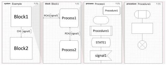 Specification and Description Language (SDL) is an object-oriented, formal language defined by The International Telecommunications Union-Telecommunications Standardization Sector [25], formerly Comité Consultatif International Telegraphique et Telephonique (CCITT), in recommendation Z.100. The language is intended for the specification of complex, event-driven, real-time, and interactive applications involving many concurrent activities that communicate using discrete signals. SDL uses four levels to describe model behaviors: system, blocks, processes, and procedures, see Figure 1.