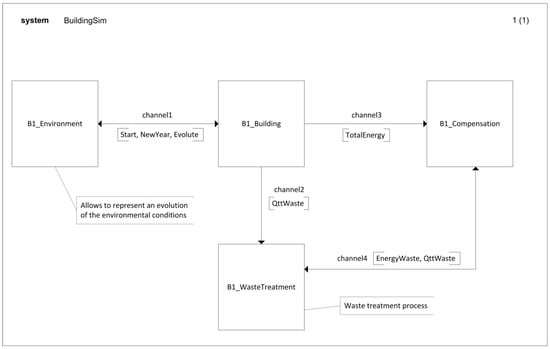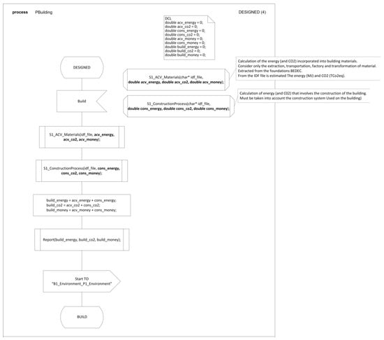 One of the aims of this research was to describe, as formally as possible, the structure and behavior of the LCA of a building. This goal was crucial as the people involved are diverse and come from many different backgrounds. To address this issue, we used SDL to formally define the model. The use of the SDL language afforded maximum flexibility to integrate new processes and procedures to the system in a co-simulation scenario [29]. Using a graphical formal language allowed nonspecialized technicians access to the programming details of the model and definitively contributed to the validation and verification processes. In addition, the explanation of the model itself was more intuitive, simple, and direct than using a programming language such as C or Java. Thus, the group can share the model, making it much easier to understand and detect errors, as well as propose improvements.