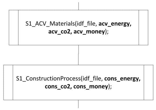 We can analyze the behavior of the PROCEDURES (that use a database to calculate the environmental, social, and economic aspects of the materials used), and the systems applied to build the model. The S1_ACV-Materials PROCEDURE analyzes the environmental impacts and the economic and social costs related to materials. The S1_ConstructionProcess PROCEDURE analyzes the construction process, as seen in Figure 5.