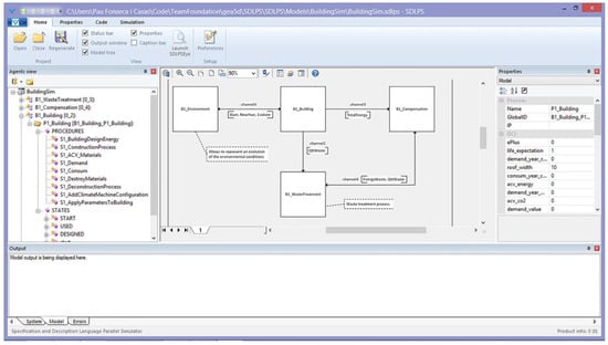 The model was implemented using SDLPS software [47,48]. SDLPS was built using C++ and C languages. The model code (written in C for the tasks and procedures of the SDL blocks) was used through a Dynamic Link Library (DLL). The model was defined directly using Microsoft Visio®, following the standard implemented on the 2013 version as SDLPS understands this format and transforms it to an XML format that represents the SDL model. This coding implies that the model can be validated and verified by reviewing the graphic diagrams in Microsoft Visio®. This property dramatically simplifies the interaction between the different actors involved in the project. Figure 6 shows the SDLPS loaded with a model for a building.
