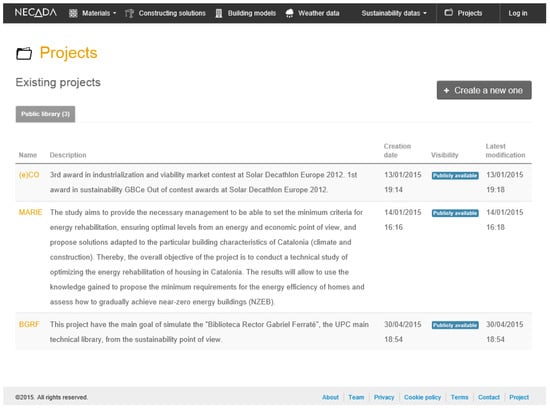 NECADA manages the parametrization of the experimental design to be executed and sends it to SDLPS, which executes the LCA building model. SDLPS acts as a simulation server executing the experiments defined over the web; Figure 8 shows the public projects of the NECADA website.
