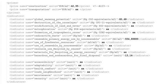 With this information—and based on the SDL model that defines the LCA of a building—the LCA could be calculated for the different scenarios. This allowed us to obtain the Pareto frontier, depending on the selected variables (see Figure 10 to review the file that contained the indicators used in the analysis). These indicators were defined formally on the SDL model and filled with the correct values using the database the modeler used on the specific project.