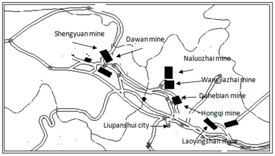 Guizhou Shuicheng Mining (Group) Co. LTD., Liupanshui, China, (hereinafter “the Shuicheng mining area”) is a large integrated enterprise engaged in coal mining, electricity generation, production of coal chemicals, etc. Local coal-bearing rocks are distributed in the Upper Permian Longtan Formation (the Xuanwei Formation). Workable and locally workable seams include seams 1#, 4#, 7#, 8#, 11#, 12#, 13#, 14-1#, 14-2#, 17#, and 28#. The Shuicheng mining area has seven producing mines in total. From northwest to southeast, this area can be divided into three tectonic units: the Ertang syncline (the Shengyuan and Dawan coal mines are coal and gas outburst mines), the Dahebian syncline (the Naluozhai, Wangjiazhai and Dahebian coal mines are coal and gas outburst mines, and Hongqi coal mine is gassy mine), and the Xiaohebian syncline (the Laoyingshan coal mine is coal and gas outburst mine). Figure 1 and Table 1 shows the Shuicheng mining area mines.