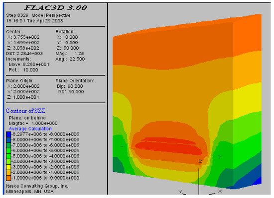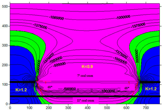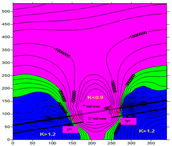 The results of the numerical simulation were analyzed. Suppose that the rock stress declined 10% after seam 7# was mined. The stress relief angles were then determined. Along the strike of the protected seam, the stress relief angle was 68° on both the left and right sides. The stress relief zone exhibited a distinct symmetrical pattern. Along the dip direction of the seam, the stress relief angle was 87° at the lower end and 79° at the upper end. Figure 3, Figure 4, Figure 5 and Figure 6 depict the simulated distribution of stress induced by mining seam 7# as a protective seam for seam 11#.