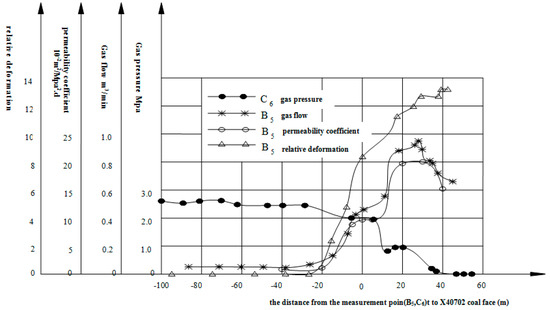 The stress relief zone was subdivided into two subzones. In the subzone that began 20 m in front of the X40702 face and terminated 17 m behind it, seam 11# started to undergo stress relief. The protected seam’s volumetric expansion increased to 10.54 × 10−3 and its permeability increased to 13.5 m2/MPa2·d, 11 times its original permeability coefficient. As a result of gas desorption, the gas pressure declined to 0.95 MPa and the borehole gas flow increased to 0.54 m3/min. This subzone corresponded to the initial stage of stress relief.