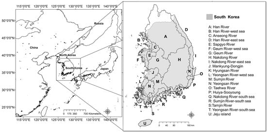More than 60% of the entire country is mountainous, and the terrain is high in the east and low in the west. Most forests in South Korea are located in mountainous areas [24]. The total area of the country is 99,720 km2, and the forest area is 64,081 km2. The Korean peninsula consists of 20 major watersheds, of which five major basins (Han River, Nakdong River, Geum River, Yeongsan River and Sumjin River) cover more than 80% of the peninsula (Figure 1). The 20 major watersheds can be categorized into a total of 849 sub-watersheds according to the tributaries.