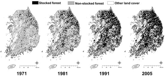 Stocked forests, which covered 532,900 ha in 1971, increased more than ten-times to 5,576,800 ha in 2010. Since 2005, all of the forests in the NFI data were indicated as the same grade, so the forest stock change maps from 2005–2010 are the same. Between 1980 and 1990, the growth rate of stocked areas was the highest among the others, with a gradual increase from 1995 (Figure 2). Spatially, in the 1970s, stocked forests were distributed only around high mountains, but gradually expanded to the whole country. In the 2000s, most forests became stocked forests (Figure 2).