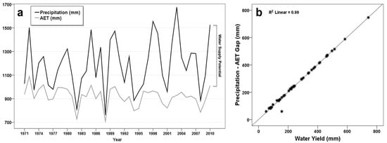 Evaluation of estimated forest water yield ((a) annual water supply potential, (b) linear regression of water supply potential and estimated forest water yield). AET, actual evapotranspiration.