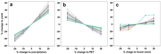 Sensitivity of the InVEST Water Yield model to variations in key input parameters for 20 main watersheds ((a) water yield-precipitation, (b) water yield-PET, (c) water yield-forest stock).
