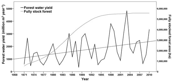 Estimates of the forest water yields over the past four decades showed that the annual differences between the water yield values were very large, but the annual average water supply in the decade has doubled. The East Asian Monsoon climate experiences abundant precipitation as reflected in the results of InVEST-WY that are highly sensitive to precipitation. Estimated forest stocks in this study continued to increase until the 2000s, but water yields were the lowest in 1988 (333.46 million m3 y−1) due to higher annual discharge (Figure 5). The decadal average results clearly showed an increase in the time series. The total annual forest water yield was 1276 million m3 y−1 in the 1970s, 1658 million m3 y−1 in the 1980s, 1813 million m3 y−1 in the 1990s and 2220 million m3 y−1 in the 2000s (Table 1). The decadal results show that the water yield increases significantly with forest stock regardless of the variability in precipitation. Although the water yield fluctuation was very large because of the high sensitivity to precipitation, forest stock contributed greatly to long-term changes.