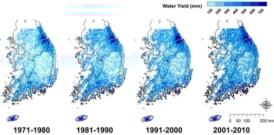 The spatial distribution of the forest water yield also showed an increase in the time series of water yield. A gradual increase in the central forest area, which was very low in the 1970s and 2000s, showed high water yields in most areas (Figure 6). There is no significant difference in the spatial pattern because the regional variations of precipitation and evapotranspiration were not great, although the annual variation of precipitation was large [23]. In particular, in the 1970s, the Nakdong River watershed, the longest river in Korea, showed a very low level of forest water yield, but the water resources of the entirety of south-east Korea showed a significant improvement in the 2000s. The Han River watershed, which is the main water resource for the metropolitan area, has also been greatly improved in recent years, leading to significant changes in the long-term water security.