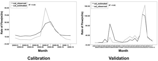 Because soil loss measurements in Korea are available only as short-term data and unsuitable for long-term simulation studies such as this one, flow data were used for evaluating the SWAT model. In comparison with data collected in 2008, the parameters were calibrated so that the R-square of the calibration curve was 0.82. Following calibration, estimated values and observed values of the 2009–2010 period were compared, and an R-square value of 0.80 was calculated, indicating a strong correlation between the model results and observed values. During the 2009 period, the difference between the simulated and observed values is shown (Figure 7). The observed flow values of 2009 were low, considering the relationship between precipitation measurements and flow in other years, suggesting a potential measurement error. If the 2009 values observed were underestimated, the actual and estimated values in other years were similar.