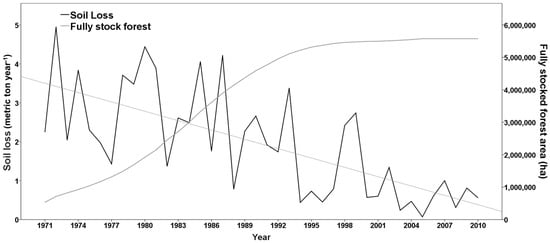 Estimation of soil loss over the past four decades showed that the annual differences in soil loss were very large, but average annual soil loss in the 2000s was one-fifth of the average annual soil loss in the 1970s (Figure 8). In South Korea, rainfall occurs intensively in the summer; therefore, the soil loss also increases in the season. The larger the amount of precipitation in the summer, the larger the annual soil loss. Annual soil loss tended to decline during the study period. Until 2000, there was a large difference in the annual soil loss because the difference in annual precipitation affected the amount of soil loss. However, since 2000, the difference in the annual soil loss has been much smaller, as the forest areas have increased, and the adaptability to precipitation has changed in the soil control areas. A linear regression analysis was performed to identify the overall trends of soil loss. The linear regression equation for the soil loss is y = −0.08x + 196.4 (x = year, y = soil loss), and the R-square value is 0.47, indicating that soil loss in South Korea decreased with increasing forest area.