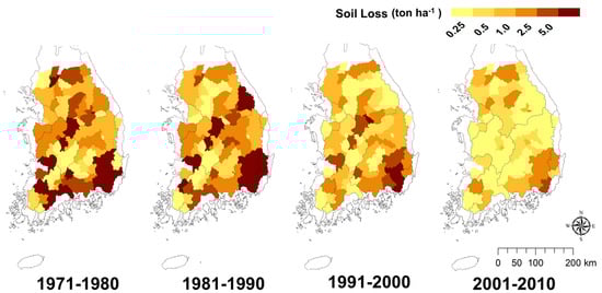 Figure 9 shows the decadal changes in soil loss by watershed unit in South Korea. Overall, soil loss has decreased; however, the difference between the soil loss estimators was very large according to east and west, because of the difference in slope. Among the five largest basins in South Korea (Han River, Nakdong River, Geum River, Yeongsan River and Sumjin River), Nakdong River showed the highest rate of soil loss, followed by Yeongsan River and Han River. The average slope is lower than the Han River, but because the Yeoungsan River watershed has much agricultural area with high soil loss rates, the amount of soil loss in the Yeoungsan River is relatively high.