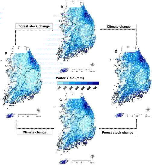 Spatial distribution of the change in forest water yield from forest stock change and climate change ((a) 1971-forest stock and 1970s climate, (b) 2005-forest stock and 1970s climate, (c) 1971-forest stock and 2000s climate, (d) 2005-forest stock and 2000s climate).