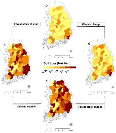 Consequently, climate change and afforestation affected the soil loss prevention during the study period. However, afforestation had the greatest effect on the soil loss prevention, and the change in forests had greater impact than climate change. Thus, the national-scale afforestation in South Korea could be a major contributor to the soil loss prevention. In addition, considering the spatial distribution of soil loss, the decrease in soil loss is greater in the east than in the west. This is because the increase in the forest stock in the east is larger than in the west; the soil loss was also spatially different according to the forest stock distribution.