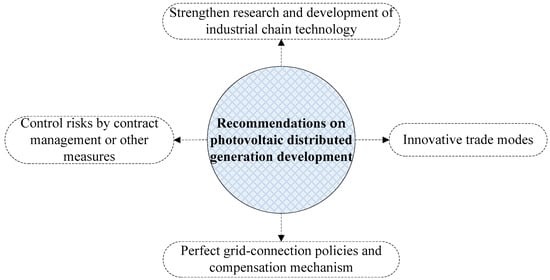 For the problems of photovoltaic distributed generation such as high economic uncertainty, defective construction, and the lack of sustainability mentioned in Section 3.2, some corresponding recommendations are proposed as follows: